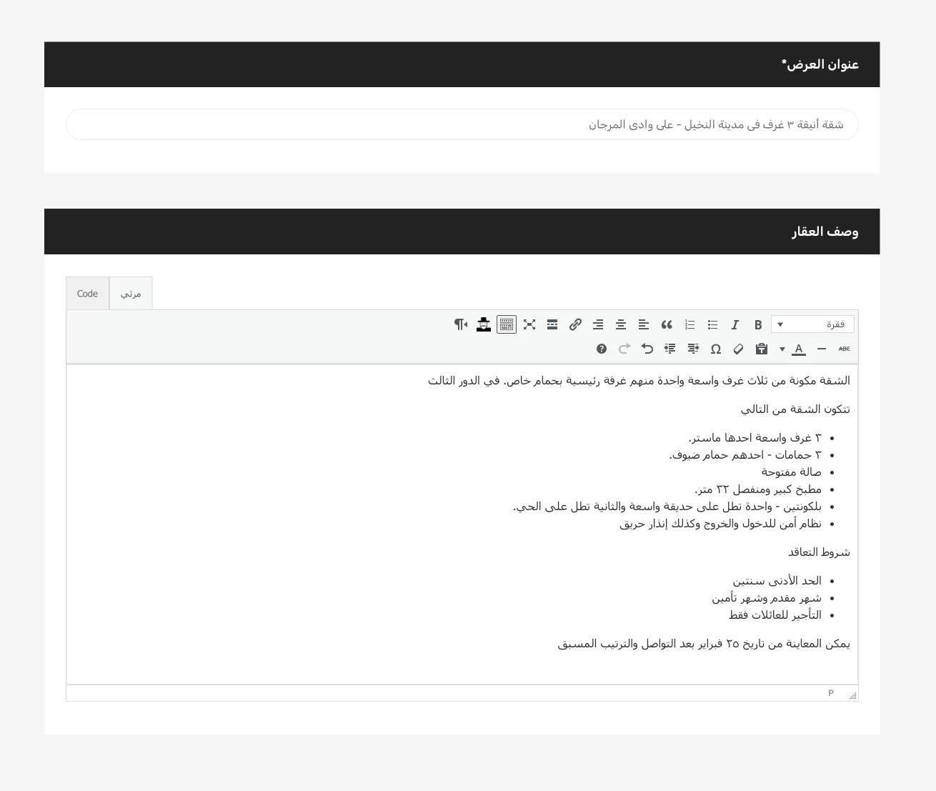 إبدأ بإدخال عنوان واضح يبين العقار المعروض ومكانه، ثم واصل كتابة الوصف.