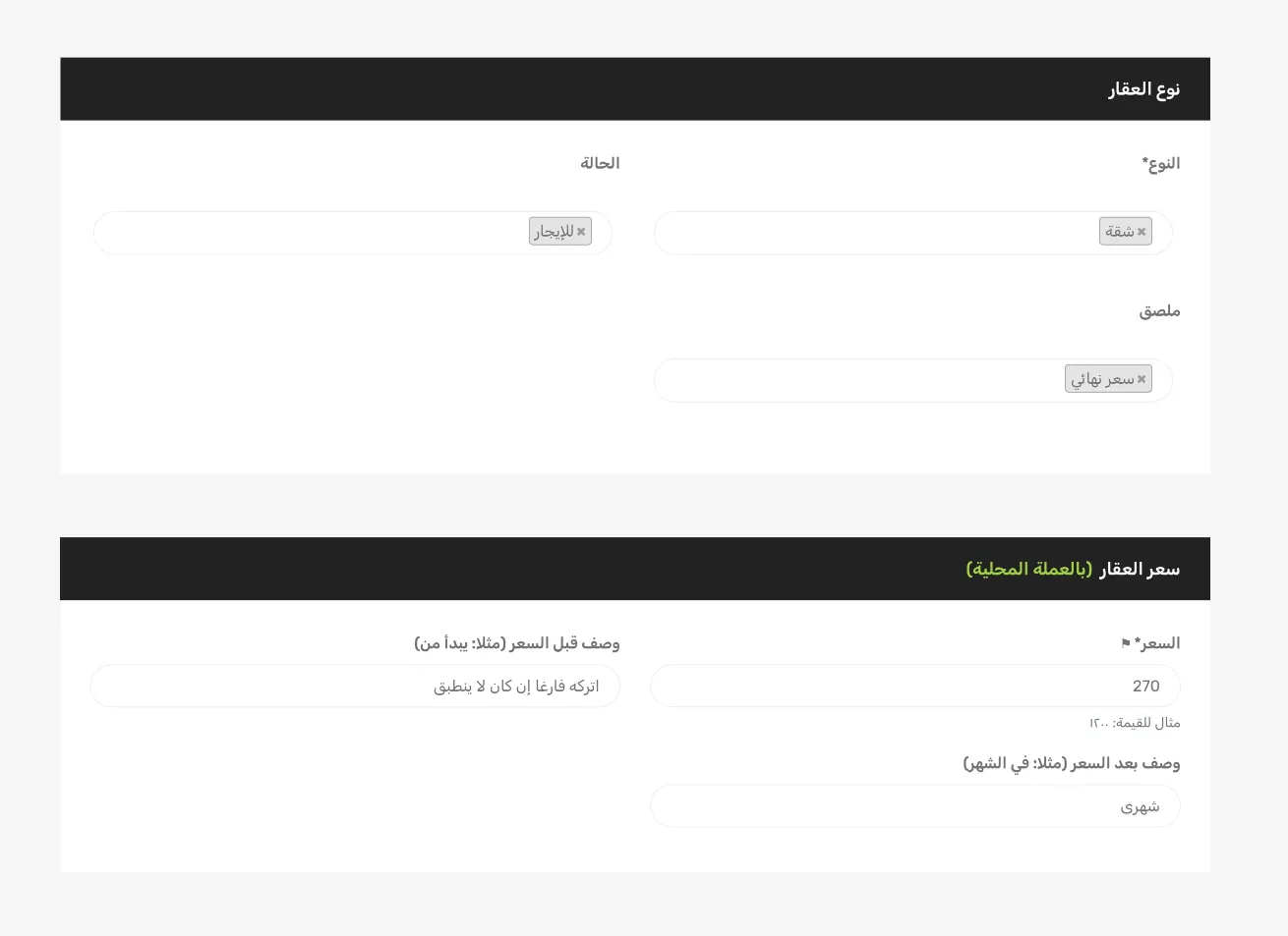 السعر يجب أن يكون بالعملة المحلية لبلد العقار. إن كان العقار يقع في مصر فالرقم يعكس القيمة بالجنيه المصري، وإن كان في الإمارات فالرقم يعكس القيمة بدرهم الإمارات وهكذا بالنسبة لبقية الدول.