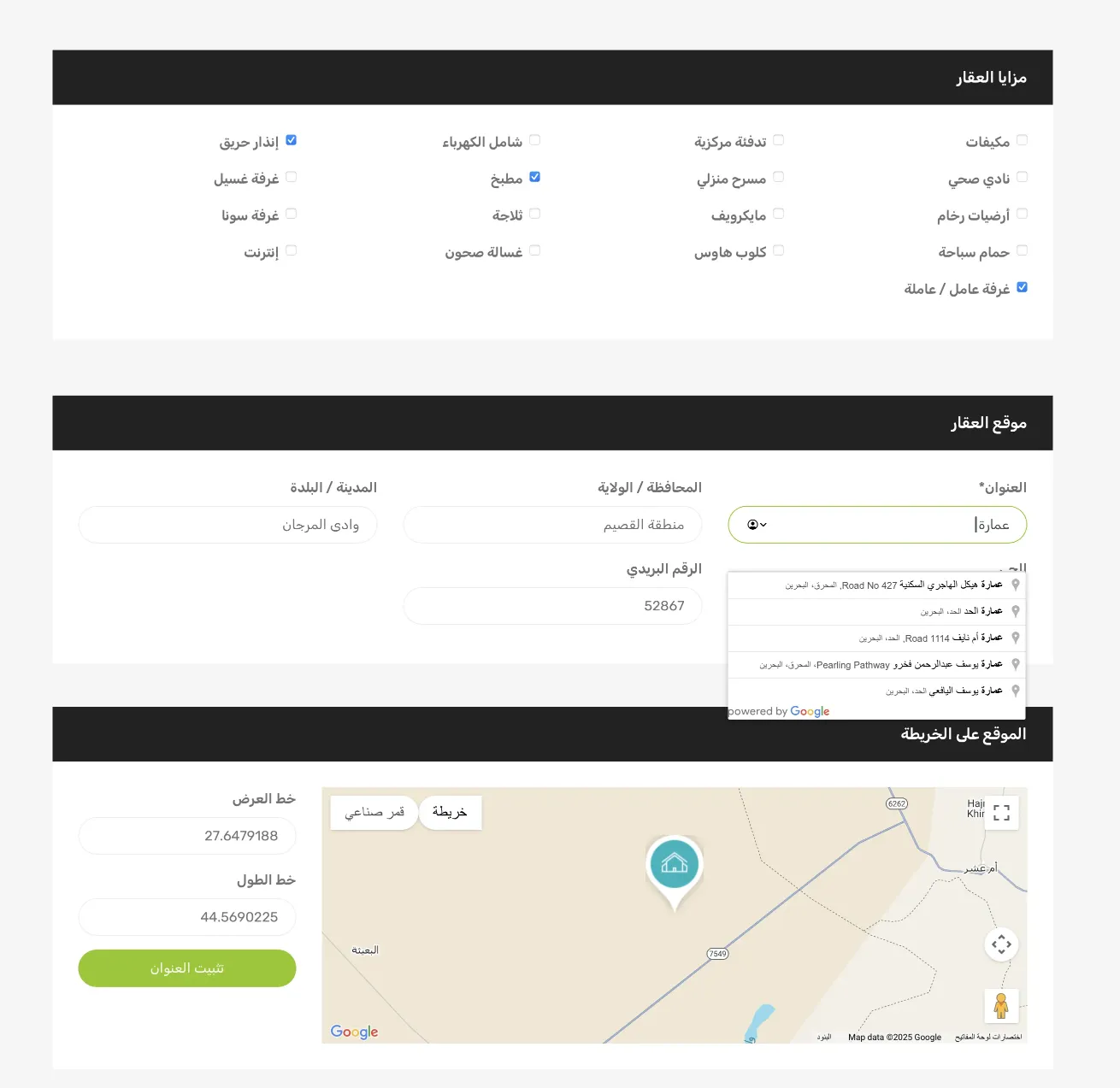 مزايا العقار واضحة وقد تزيد من رغبة الزبون في عقد صفقة. ادخل العنوان في حقل البحث وفي الغالب سيتعرف عليه محرك البحث إن كان في المناطق المنظمة أو المهمة والا فيمكنك كتابة العنوان ومن ثم تحديد المكان بالضبط عن طريق الخريطة ثم النقر على زر تثبيت العنوان. هذا يساعد المشتري على الوصول للعنوان ومعاينة الموقع قبل الإتصال بك. بالنسبة للشقق لا تحتاج الى كتابة رقم الشقة فيمكن الإكتفاء برقم العمارة. وفرنا لك خريطة تساعد المشترى على معرفة الخدمات الحيوية القريبة من العقار